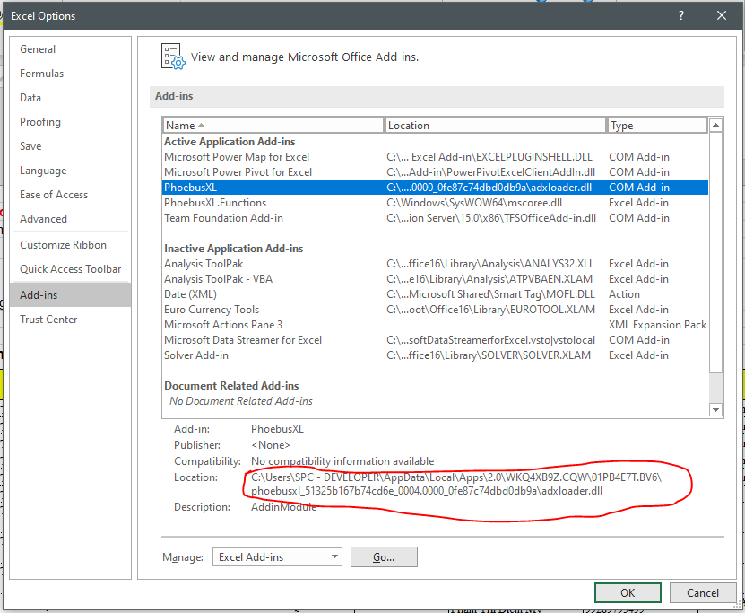 B1: Lưu lại đường dẫn Phoebus XL add-ins Location trong Add-ins như hình bên dưới.