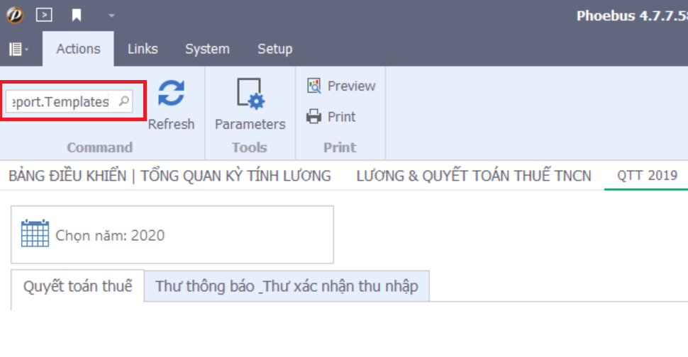 B4. Upload file lên hệ thống, bằng cách gõ lệnh pbs.BO.Report.Templates vào ô lệnh (xem ảnh minh hoạ) -> enter